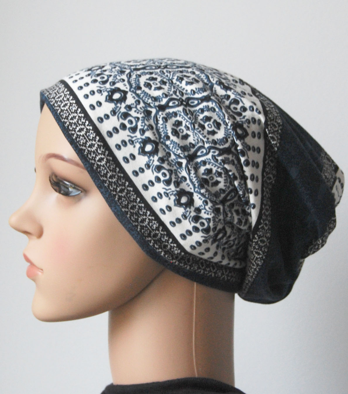 Diese Mütze besteht aus Viskosejersey in einem blau/weißen unregelmäßigem Muster, in sich gestreift. Je nach Zuschnitt kann das Muster variieren.