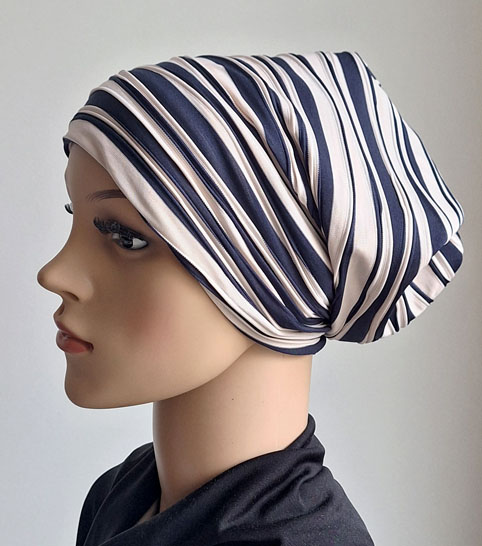 Farbe: Der Stoff ist gestreift in blau und creme und zusätzlich in Falten gelegt. Der Stoff ist nicht sehr dehnbar, daher eher etwas für kleine Köpfe.