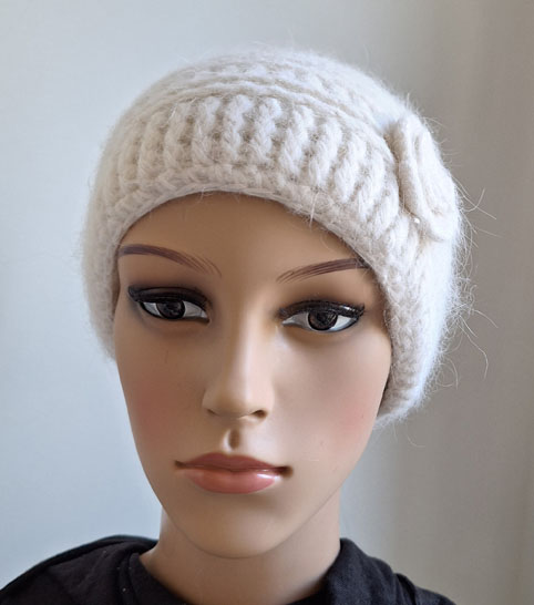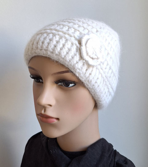 Strickmütze, creme, weiches Angora, kleiner Blume