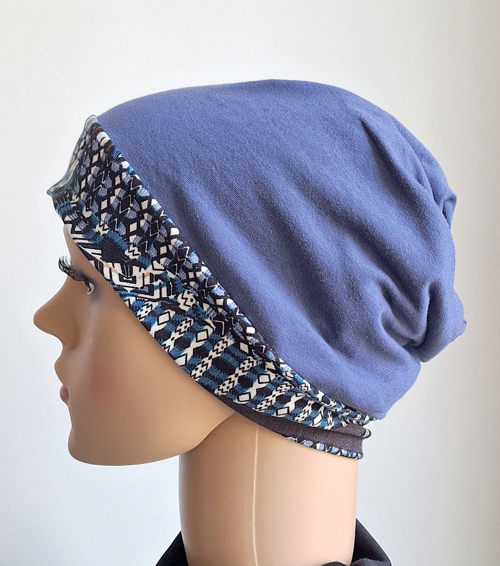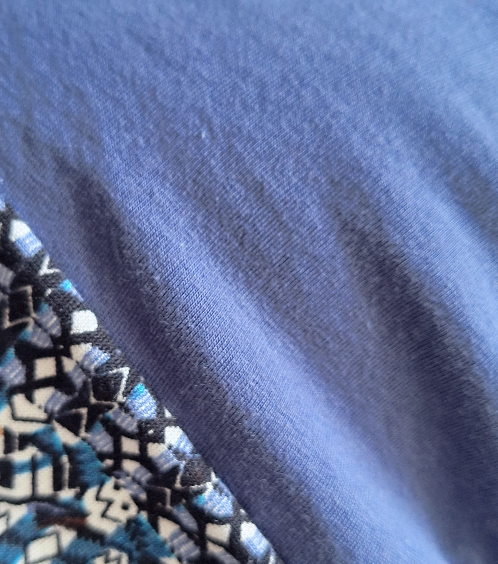 Farbe: blau mit zwei gemusterten Jerseys kombiniert.