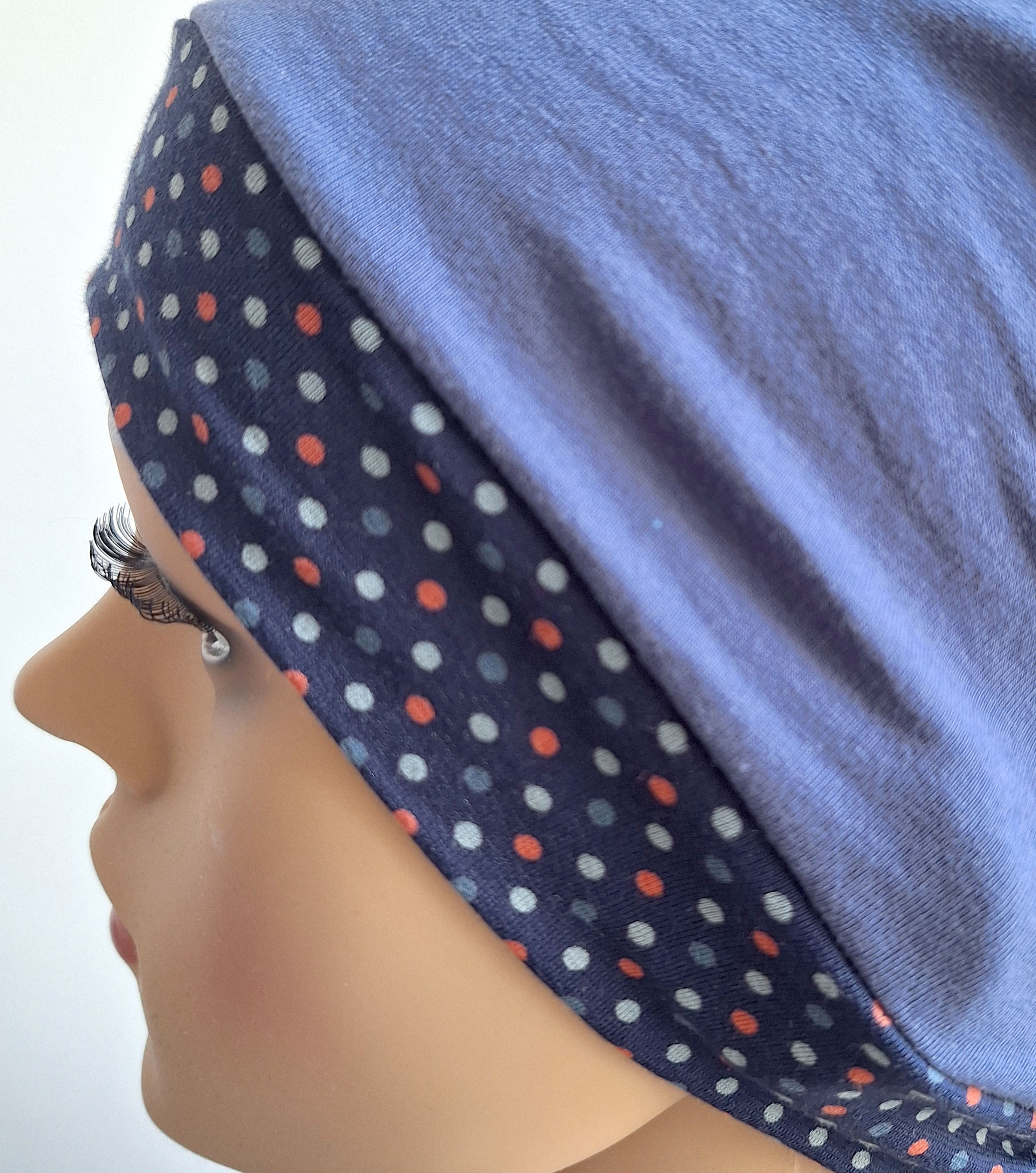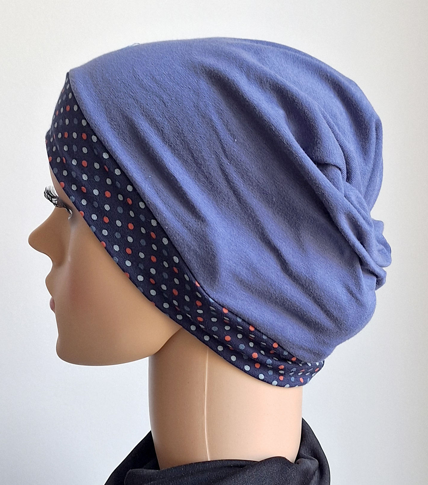 Für das Modell "comfort Sommer" habe ich gemusterte und unifarbene Stoffe miteinander kombiniert. Ich hoffe, Sie finden die Kombination genauso schön wie ich. Sie können den Schlauch drehen, dann wird das andere Muster sichtbar. Wenn sie die den Schlauch einschlagen dann können sie ihn einfarbig tragen.