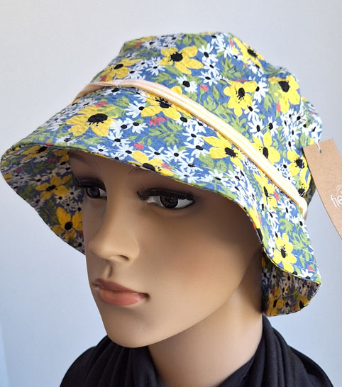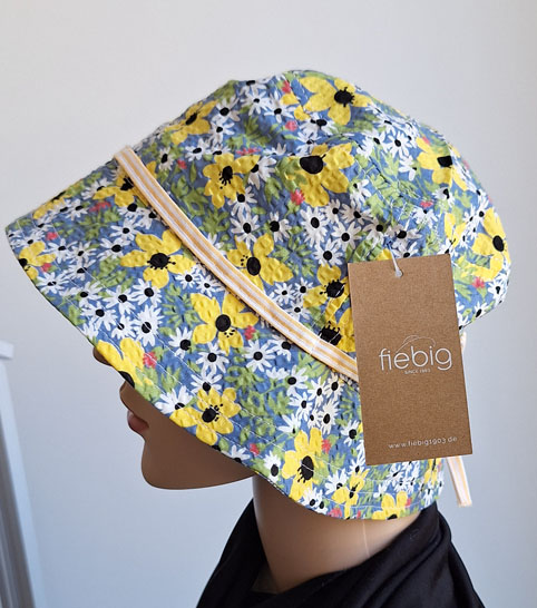 Sommermütze aus Baumwolle im Fischermützenstil, die Mütze ist gelb/bunt geblümt.