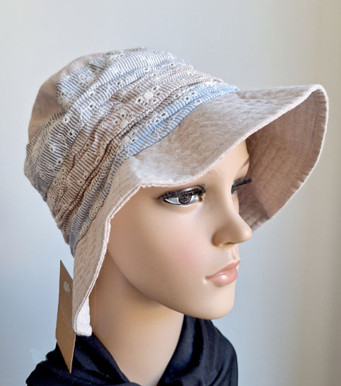 Sehr eichter Sommerhut in hellem beige mit dezentem Hingucker rund um den Kopf: Es sieht aus, als wenn ein Tuch um den Hut gewickelt wurde, es ist aber alles festgenäht.