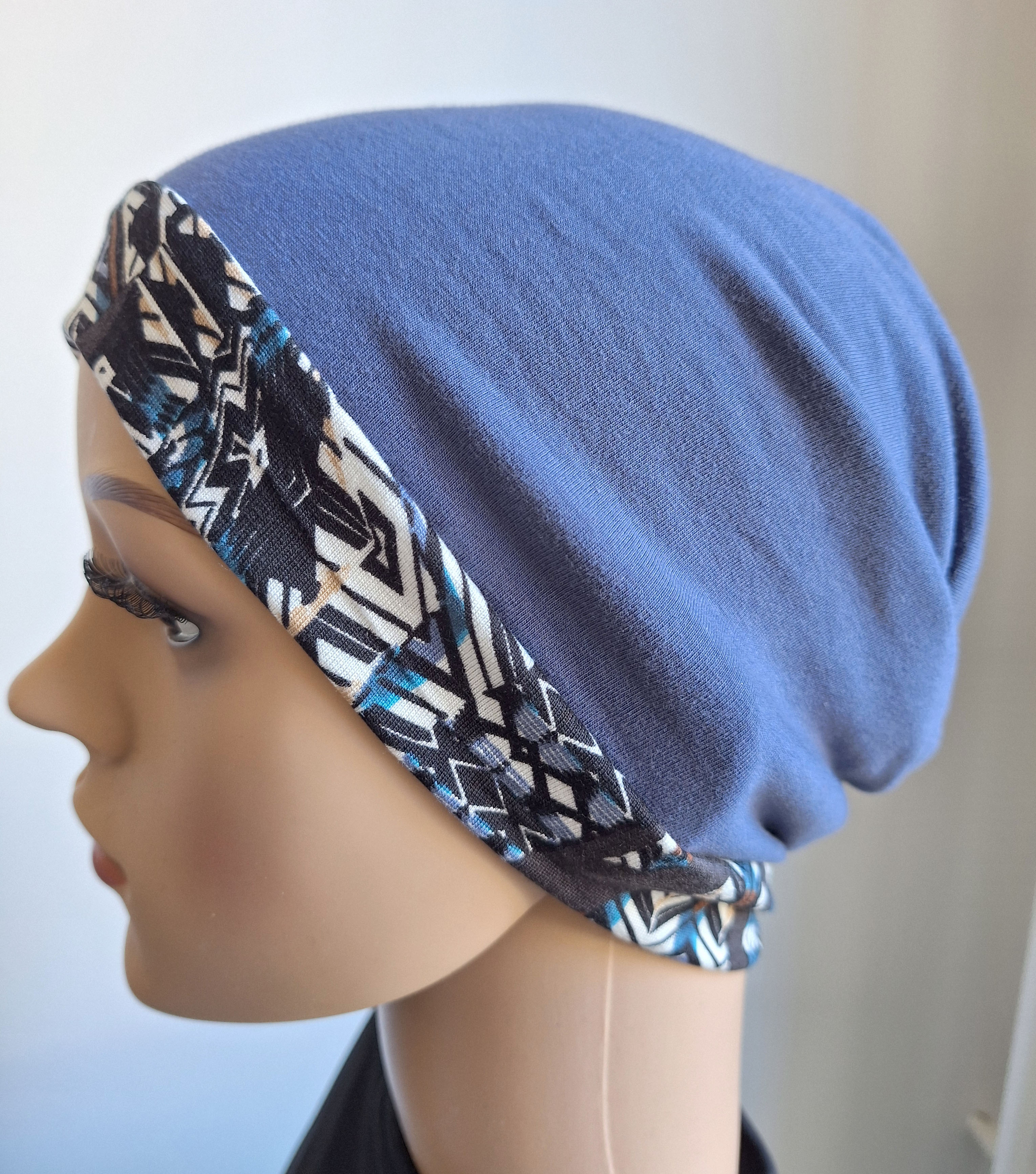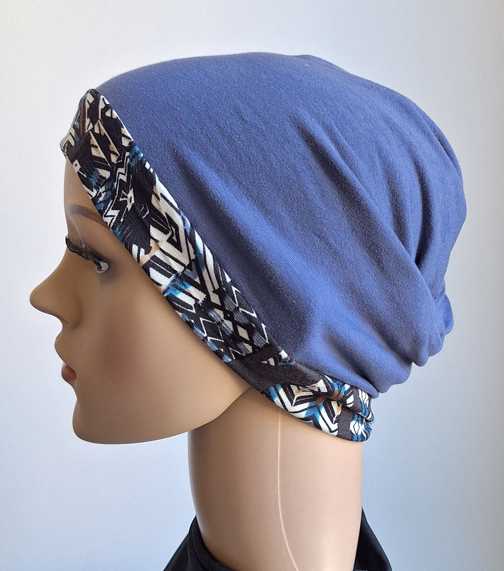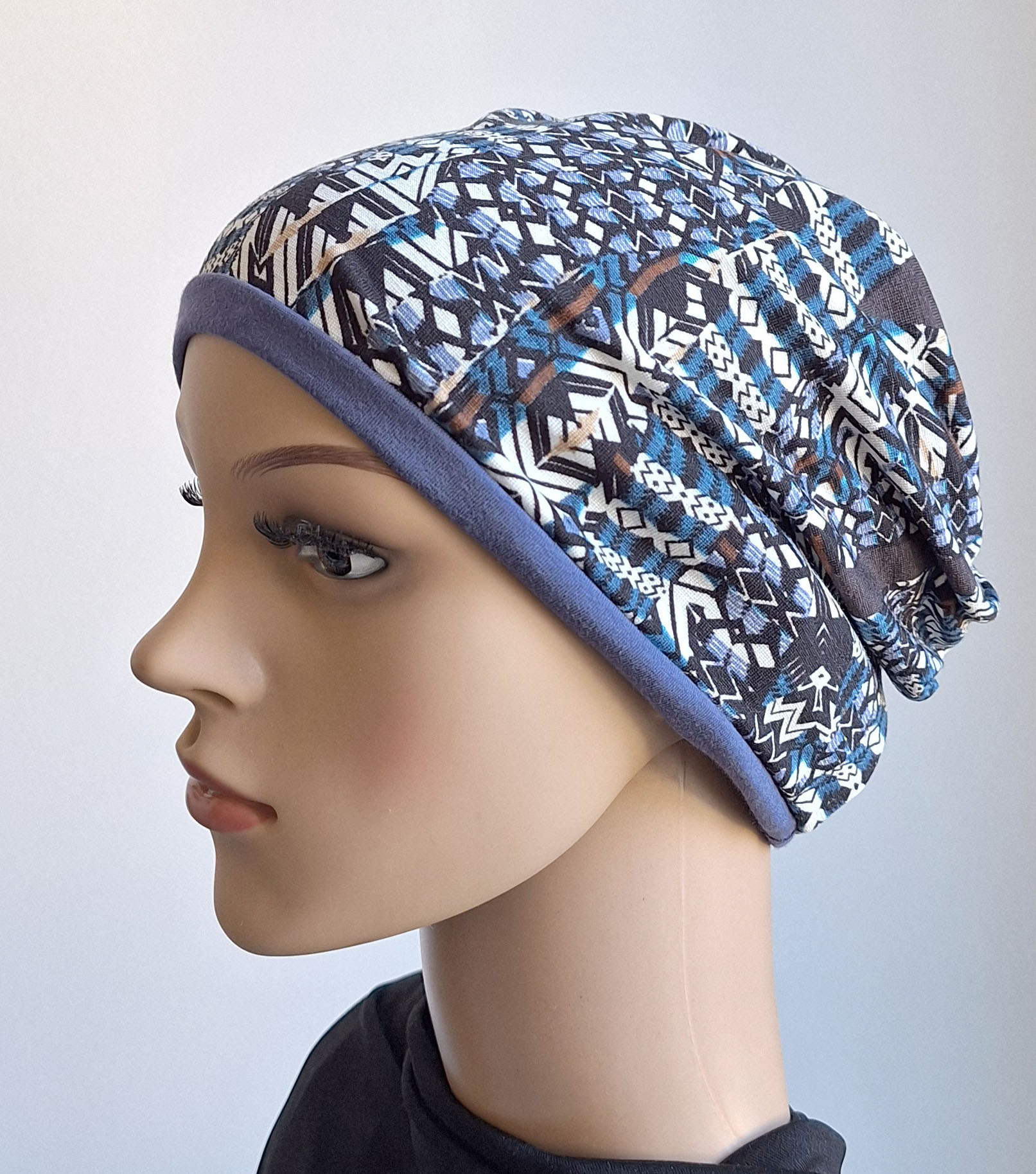 Für das Modell "comfort" habe ich gemusterte und unifarbene Stoffe miteinander kombiniert, eine Seite ist immer uni, die andere Seite gemustert. So können Sie selbst entscheiden, welche Seite Sie nach außen tragen möchten. Die ca. 45 cm lange Schlauchmütze ist nämlich wendbar, Sie haben sozusagen zwei Mützen in einer.