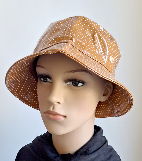 Regenhut in terracotta mit kleinen weißen Pünktchen.