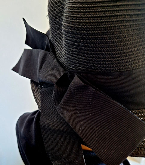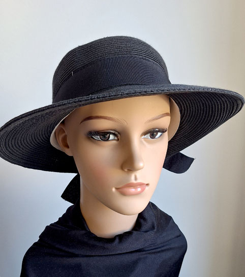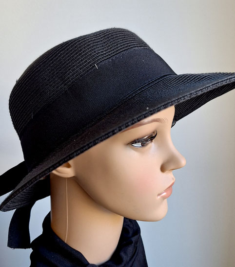 Sommerhut aus Papier in Schwarz mit einer schwarzen Schleife. Sehr gut bei Sonnenwetter, die große Krempe die Sonne gut in Schach.