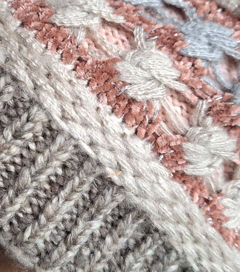 Obermaterial: 75% Polyacryl, 12 % Lurex, 8% Polyester, 5 % andere Fasern