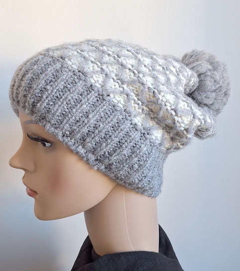 Strickpudelmütze hellgrau/creme gemustert