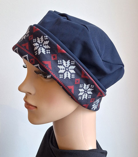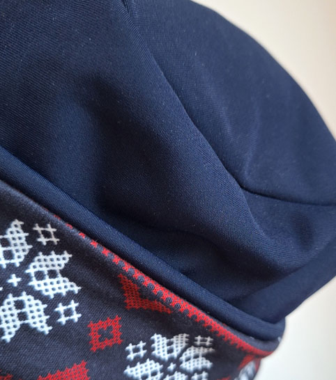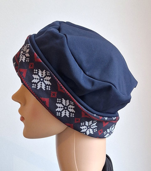Warme Mütze für den Winter in der Kombination aus Plyesterfleece (glatte Seite ist außen) in blau mit einem Norwegermuster. Die Mütze ist nicht wendbar. Sollten Sie dieses bevorzugen, sehen Sie sich bitte das Modell special an.